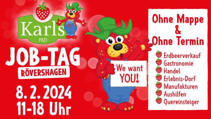 Karls Erlebnis-Dorf öffnet am 08. Februar 2024 von 11:00 bis 18:00 Uhr seine Türen für alle Jobinteressierten und lädt herzlich zum Job- Tag mit Soforteinstellung ins Erdbeer-Waffelhaus ein. Neugierige haben die einzigartige Gelegenheit, sich ohne Terminvereinbarung und ohne Bewerbungsmappe direkt vor Ort für eine der mehr als 45 offenen Vollzeit-, Teilzeit- und Aushilfsstellen zu bewerben.